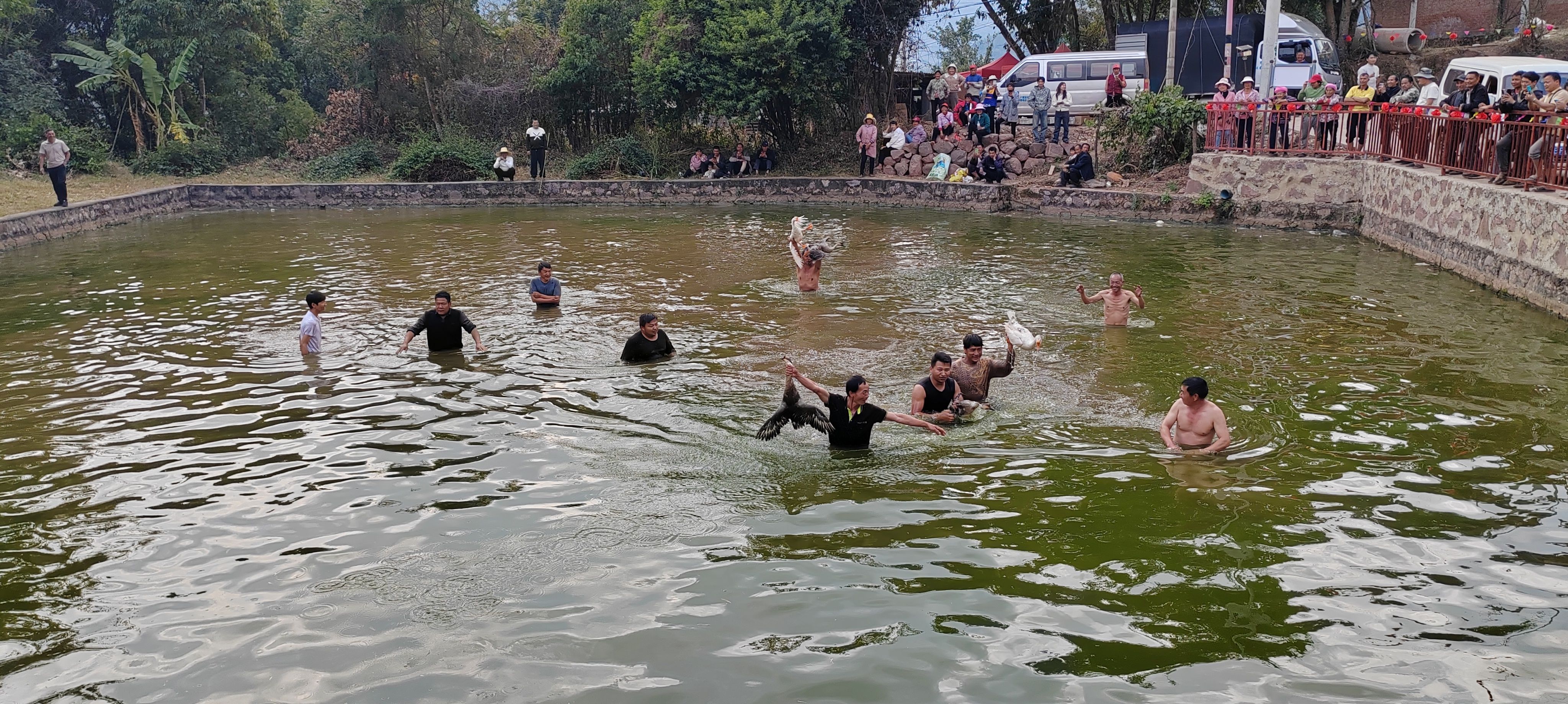 “加油,加油,加油.......”在捉鹅比赛现场,随着裁判的一声令下,参赛者们纷纷跳入鹅池,展开了一场激烈的捉鹅大战,他们身手敏捷地穿梭在鹅群之间,眼疾手快地捉住一只只肥硕的大鹅。现场气氛紧张而热烈,观众纷纷为选手们加油鼓劲,欢笑声和呐喊声此起彼伏。