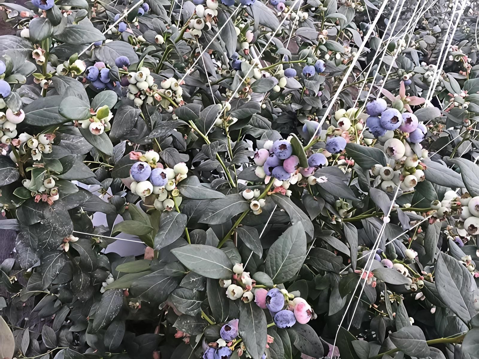 时下,走进双柏县大庄镇鸡冠山蓝莓基地,连片的自动化大棚整齐排列,棚内一株株蓝莓树郁郁葱葱,根系舒展在蓬松的基质盆中,枝头白花星星点点,饱满的蓝紫色果实缀满藤蔓,浓郁的果香扑面而来。采摘工人们穿梭在大棚里,娴熟地挑选着成熟果实,欢声笑语里洋溢着丰收的喜悦。