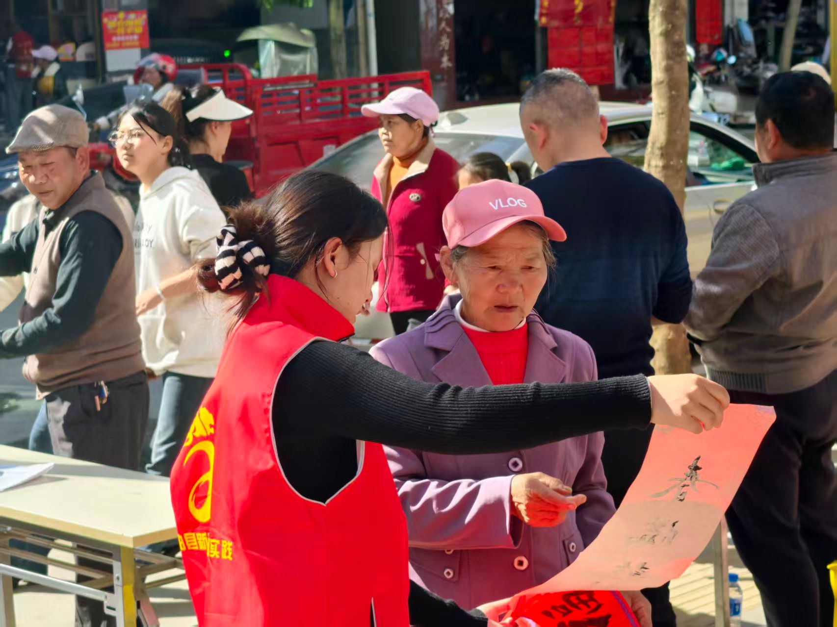 孩子们围在桌子旁,好奇地观摩笔墨流转,时不时发出阵阵赞叹;老人们看着志愿者手中刚写好的春联,细细品读联中寓意。“手写的春联更有年味,红红的联纸和浓浓的墨香,瞬间有了春节的喜庆氛围”,刚领到春联的王大哥捧着红联,连连为活动点赞。