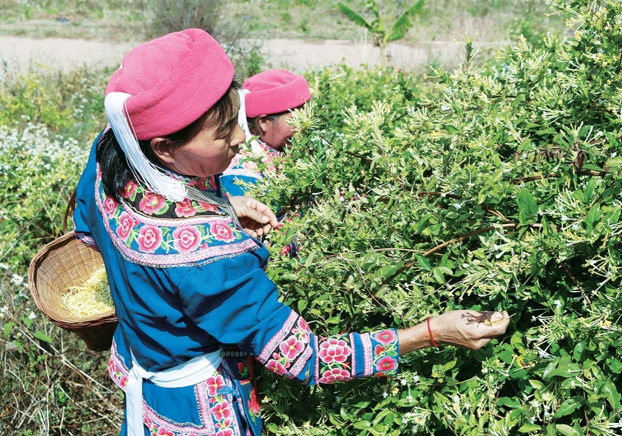 初春时节,双柏县安龙堡乡说全村的金银花迎来盛花期,一簇簇黄白相间的花朵在春风中摇曳,村民们正忙着采摘一朵朵“致富花”。