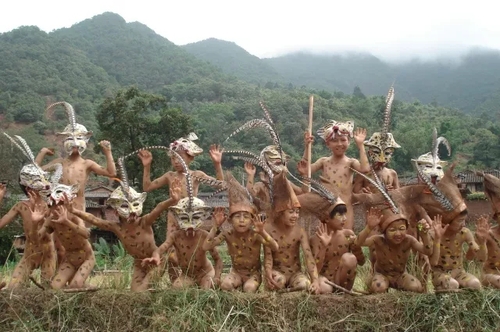 随后,小豹子们又来到野外的庄稼地里,模仿人类劳动生产场景,表演各种劳耕游戏。随着锣鼓声越来越密,他们转而跳起各种各样的兽类舞蹈,只见他们纷纷模仿豹子的爬行、格斗、嘶咬、交尾……意在撵鬼驱邪除害,祈求来年风调雨顺,五谷丰登,人畜兴旺。