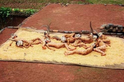 小豹子节这一天,全村的彝族群众就从村中选出十几名9至12岁的男孩子做小豹子,再从六汁江边捡回白色、红色、黑色、黄色的各种石头,磨成五颜六色的墨汁,然后脱光这些男孩子的衣裤,在赤裸的身上绘满豹子花纹及日月星辰等图案。从棕树上剥下棕片,缝制成一个面具戴在裸体男孩头上,头上再插两根长长的、色泽艳丽的箐鸡尾毛。化装完毕的小豹子们就不能再说话,因此,就是平时和他们最亲近的伙伴也很难认出他们。在这种棕片面具之下,他们可以无拘无束地进行小豹子笙的表演。