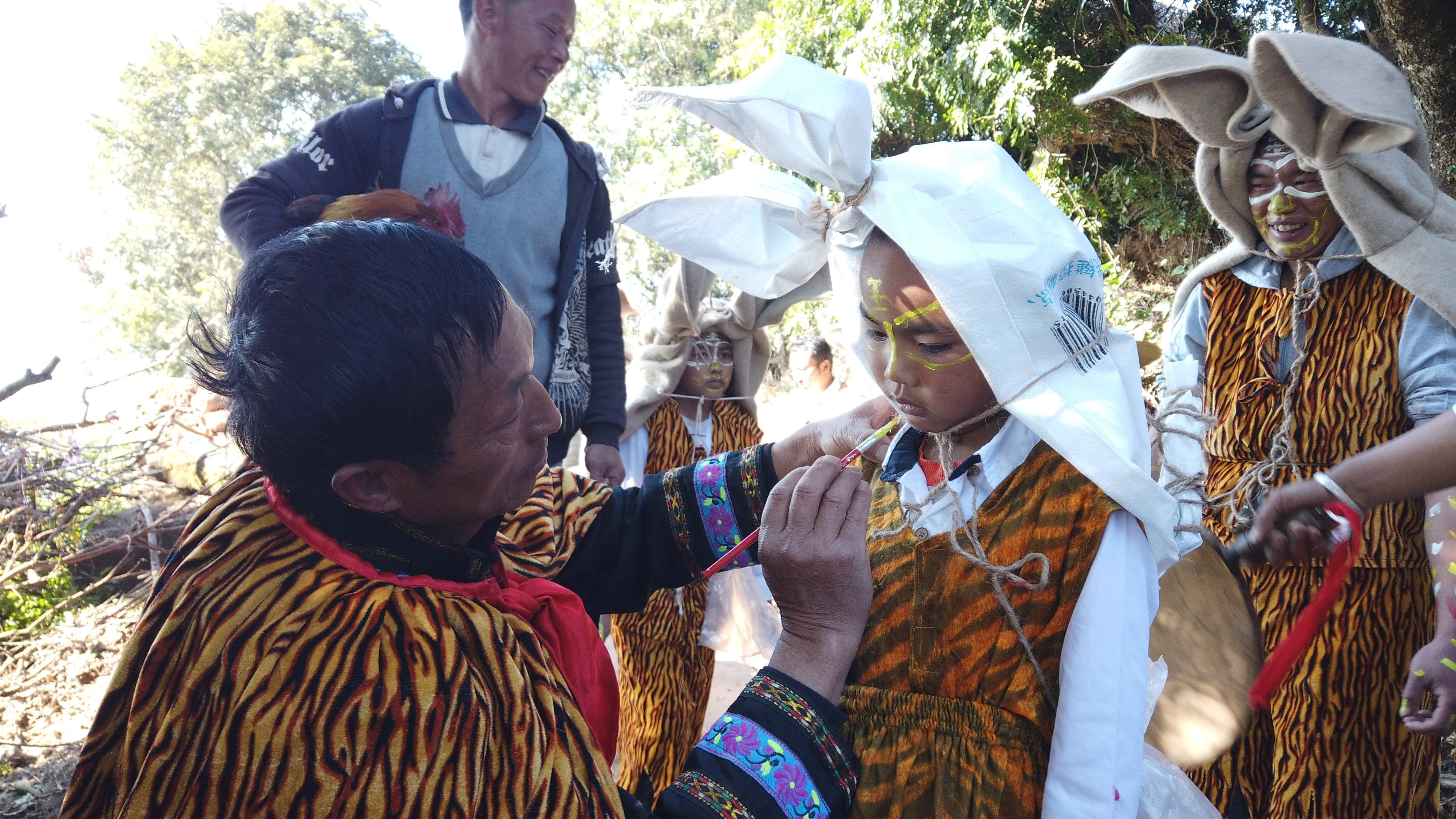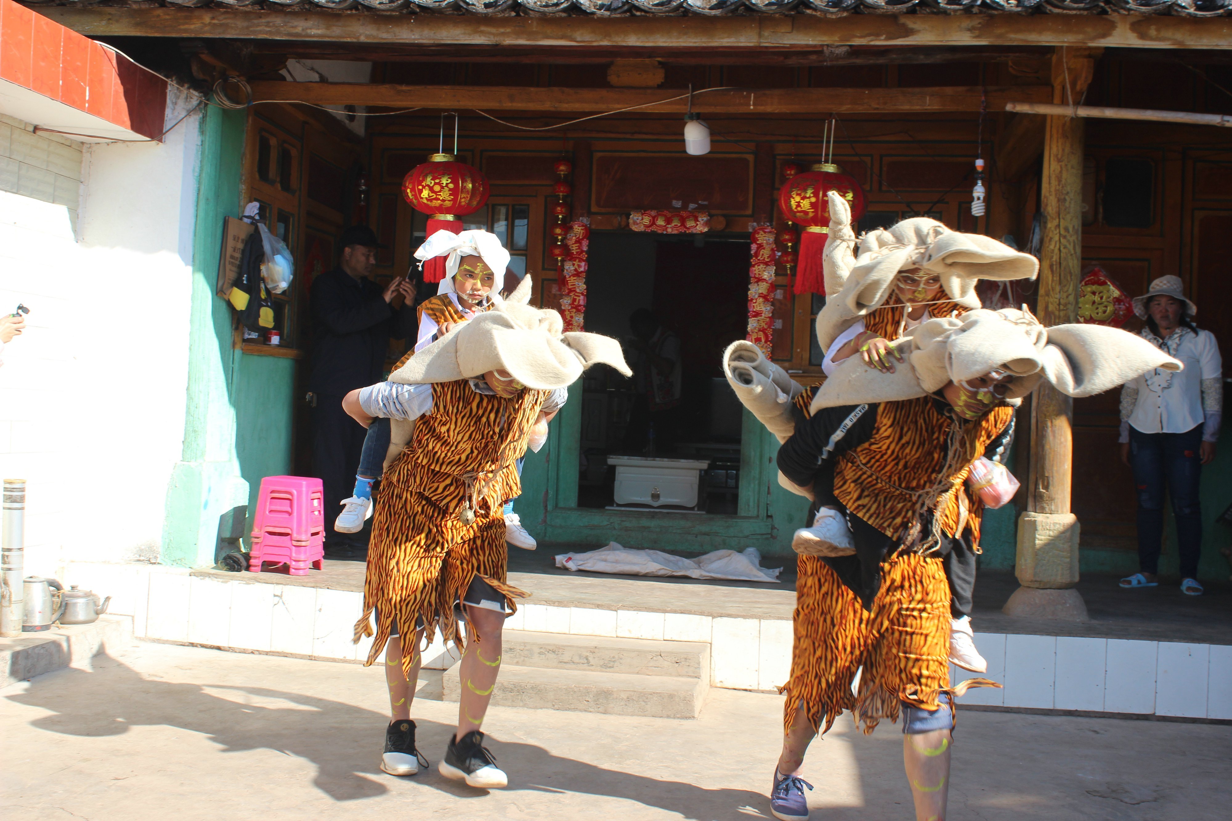 毕摩负责领队整套祭祀仪式,组织20多名男性将毡子捆扎成的虎皮披在肩上,身体用各种颜料画上虎纹,在铜锣和羊皮扁鼓伴奏下跳虎图腾舞。队伍中的“小老虎”代表虎神庇佑下成长的新一代;猫作为代替老虎“徒弟”在虎窜家时收下村民供奉的心意;正月初十时“虎王”“山神”在祭祀时负责背“小老虎”。