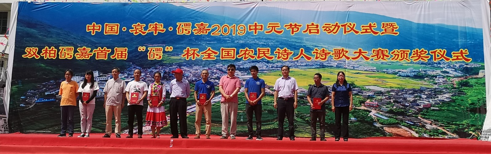 大赛自2019年7月2日发布征稿启事启动以来,大赛组委会共收到全国100多名农民诗人朋友提交的100多件作品,这些作品反映了双柏县(石咢)嘉的自然风光、厚重的民族文化、和谐的社会环境、民情风俗等。为期一个月的征稿结束后,组委会办公室对征集到的稿件进行了匿名处理,邀请国内知名作家诗人叶延滨、雷平阳、霍俊明、罗振亚、李小松五位老师进行评审,经过公平、公正的评选和为期三天的公示后,最终评选出一等奖一名、二等奖三名、三等奖五名、优秀奖十名,在8月14日的中国•哀牢•(石咢)嘉中元节启动仪式上,对部分获奖作者进行颁奖。