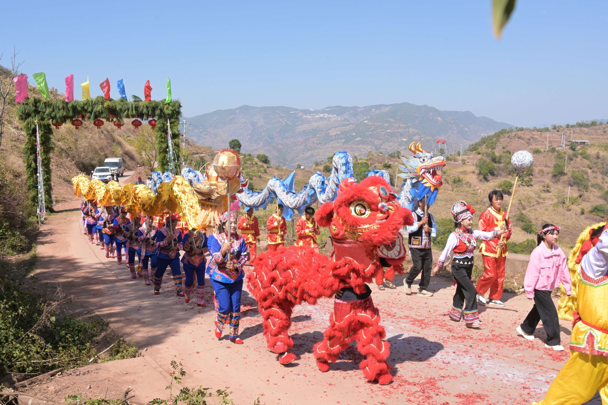 “咚咚锵、咚咚锵……”伴随着震天的锣鼓声,文艺巡演在气势磅礴的《舞龙舞狮》中拉开帷幕。长龙腾跃翻滚,金色的鳞甲在阳光下熠熠生辉。村民们穿着绚丽的民族盛装,一路载歌载舞,沿街巡演,将传统民间艺术的魅力展现得淋漓尽致。随后,文艺演出在欢呼声中正式开场。由村民自编自导自演的民族舞欢快奔放,四弦舞轻盈优雅,《父老乡亲》唱出对家乡的眷恋,原生态的《啊噻调》以悠扬古朴的曲调,诉说着彝家人民的热情好客。围观群众不时举起手机,定格一个个精彩瞬间,现场笑声连连、掌声不断,升腾着浓浓的年味。