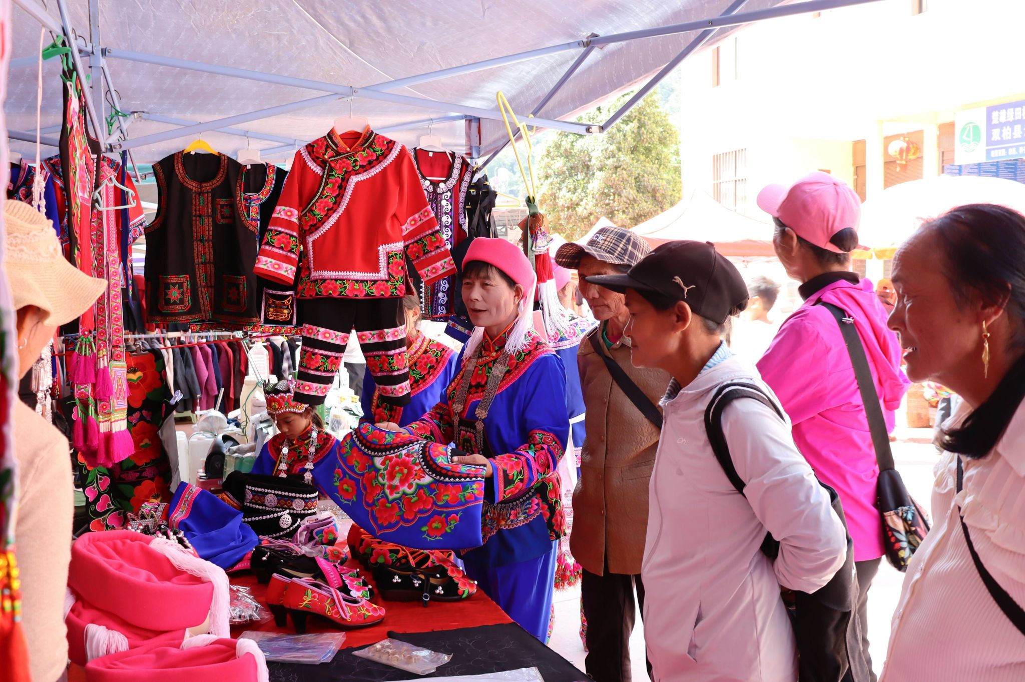 舞台之外,长长的街道同样热闹非凡。热气腾腾的特色美食、新鲜水灵的果蔬、琳琅满目的彝绣产品与本地农特产品沿街摆开。带着乡音的吆喝叫卖声、游客的询价声、孩童的欢笑声此起彼伏,汇聚成一首生动的乡村市集交响曲。
