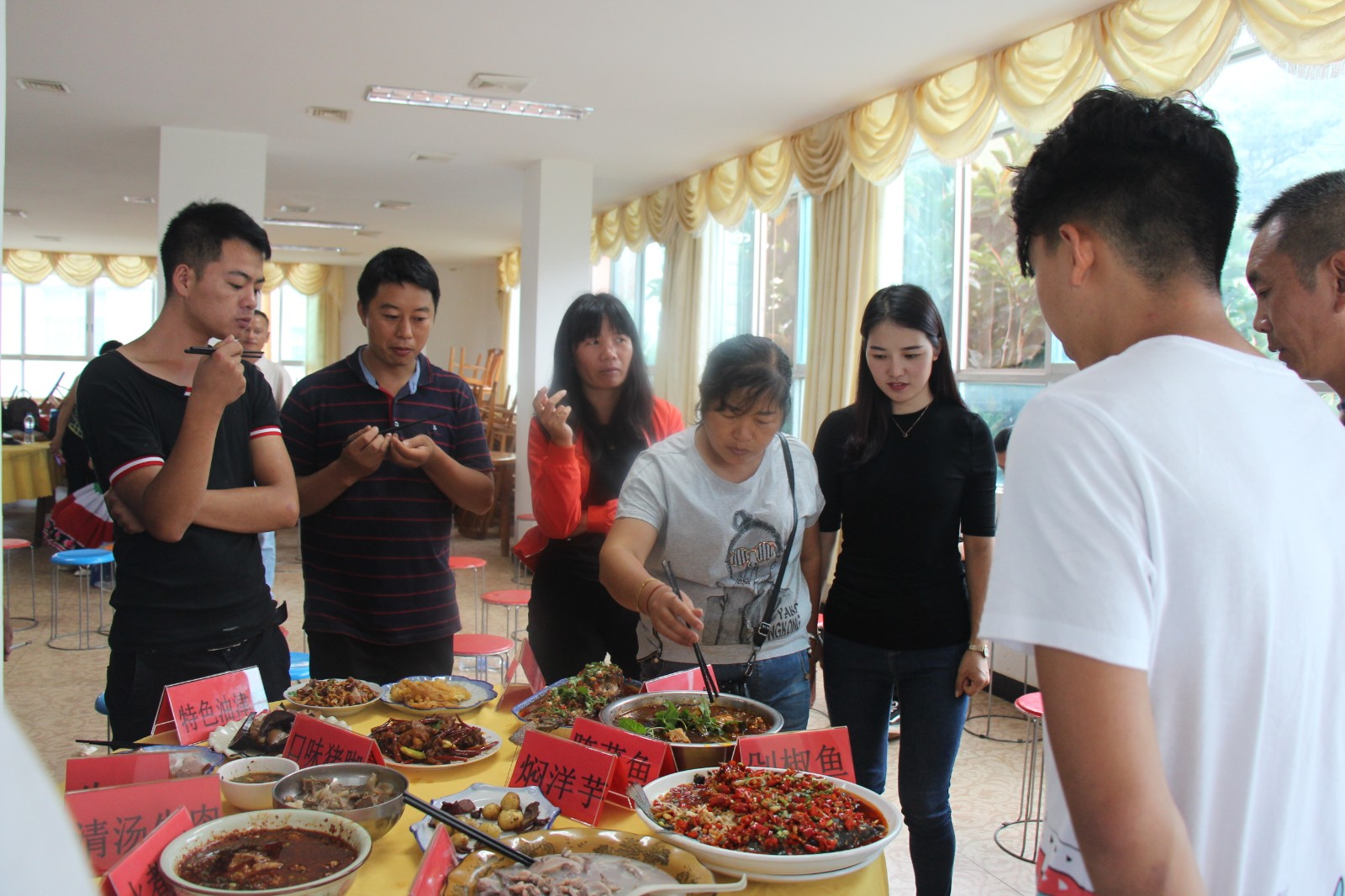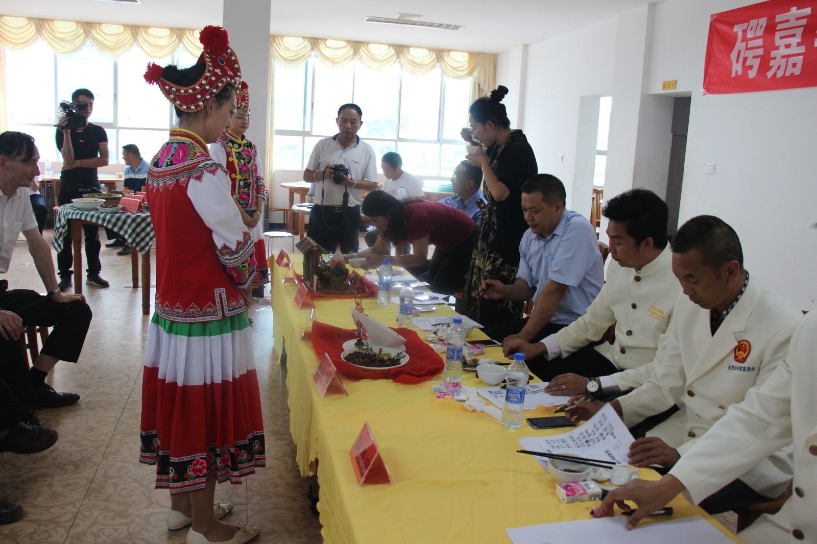 11日下午4:00双柏县石咢嘉镇首届美食大赛在福双喜大酒店拉开帷幕,镇上共有13家酒店、餐馆参加比赛,比赛均以本地特色食材为素材进行原汁原味的加工与创作,各色菜品琳琅满目,刺激着评委和观众的眼球及味蕾,一道道良心美味以色香味俱全的姿态呈现在评委和观众面前。