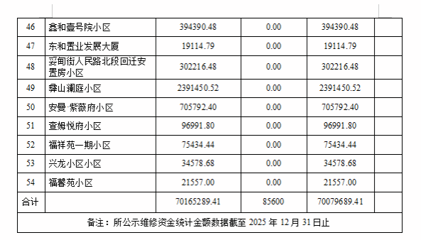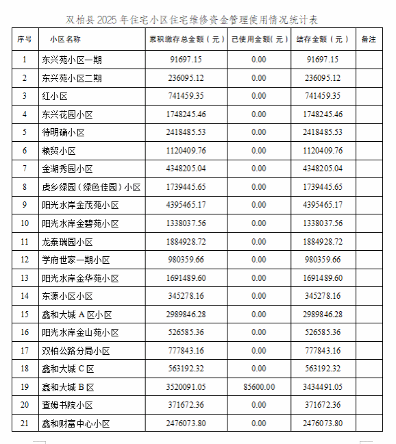 为进一步规范双柏县住宅专项维修资金的交存管理工作,维护住宅专项维修资金所有者的合法权益,根据《住宅专项维修资金管理办法》(建设部、财政部第165号令)《云南省住房和城乡建设厅关于进一步加强和规范住宅专项维修资金管理相关工作的通知》《双柏县住宅专项维修资金管理暂行办法(试行)》(双政办规〔2022〕2号)要求,现将双柏县2025年度住宅专项维修资金交存、管理、使用情况公示如下:
