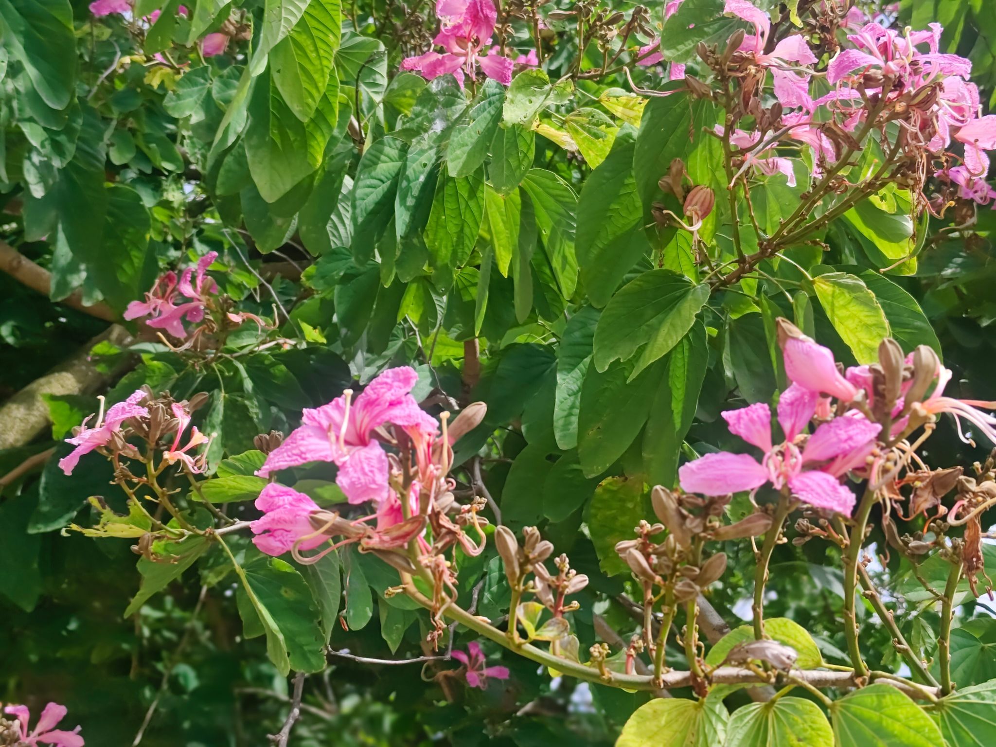 𥔲嘉的紫荆花开在道路两旁,阳光穿过花枝,温柔地洒在道路上,紫荆花的花瓣在秋日的暖阳下显得生机勃勃。一阵秋风吹过,树影婆娑,风影摇曳,放眼望去,时不时有花瓣飘飘洒洒,落英缤纷,美不胜收。驾车行驶其间,摇下车窗,微风裹挟着淡淡花香,一路芬芳相伴;漫步花径,头顶是花团锦簇,脚下是花瓣铺毯,每一步都踏入梦幻之境。