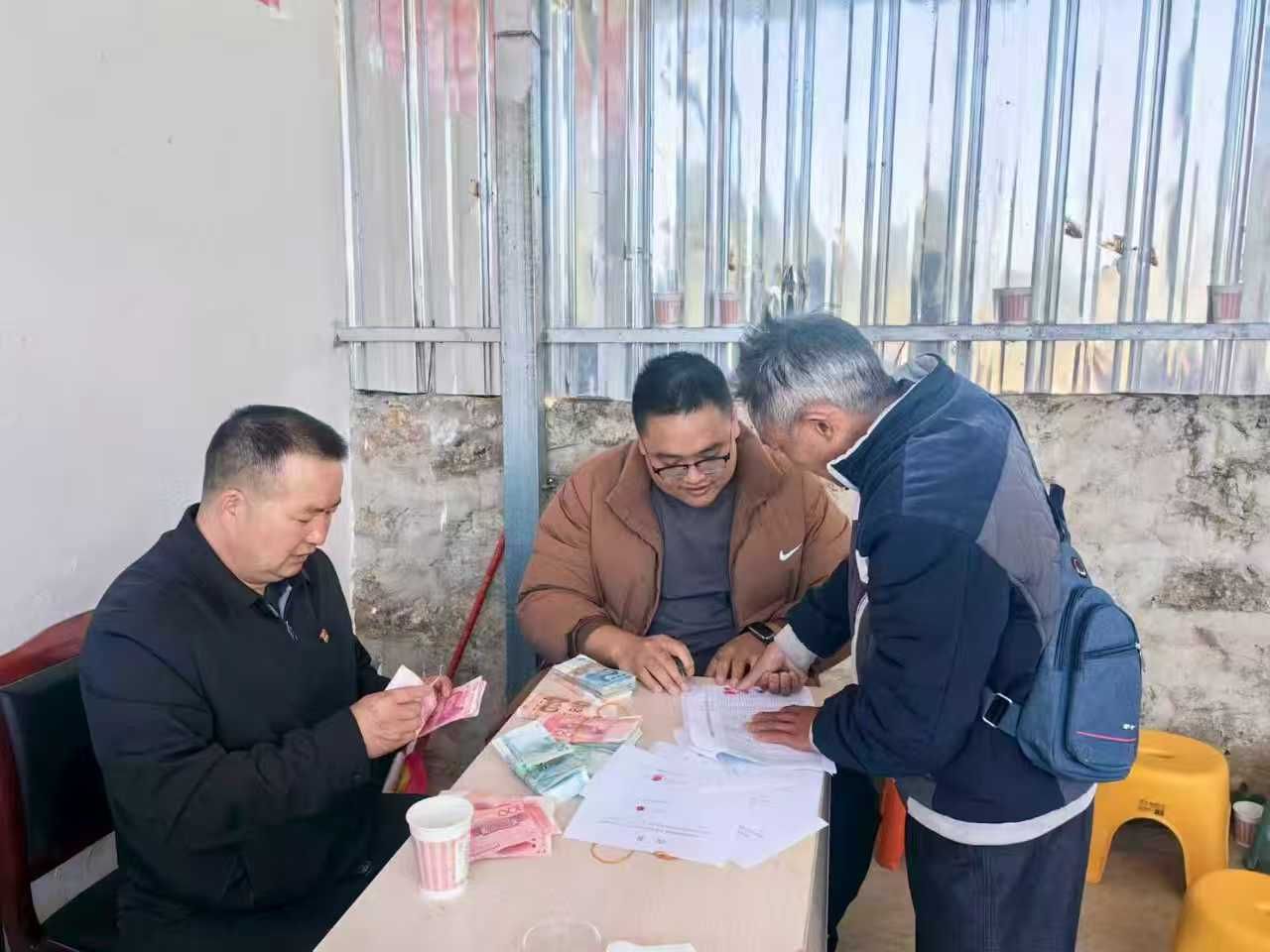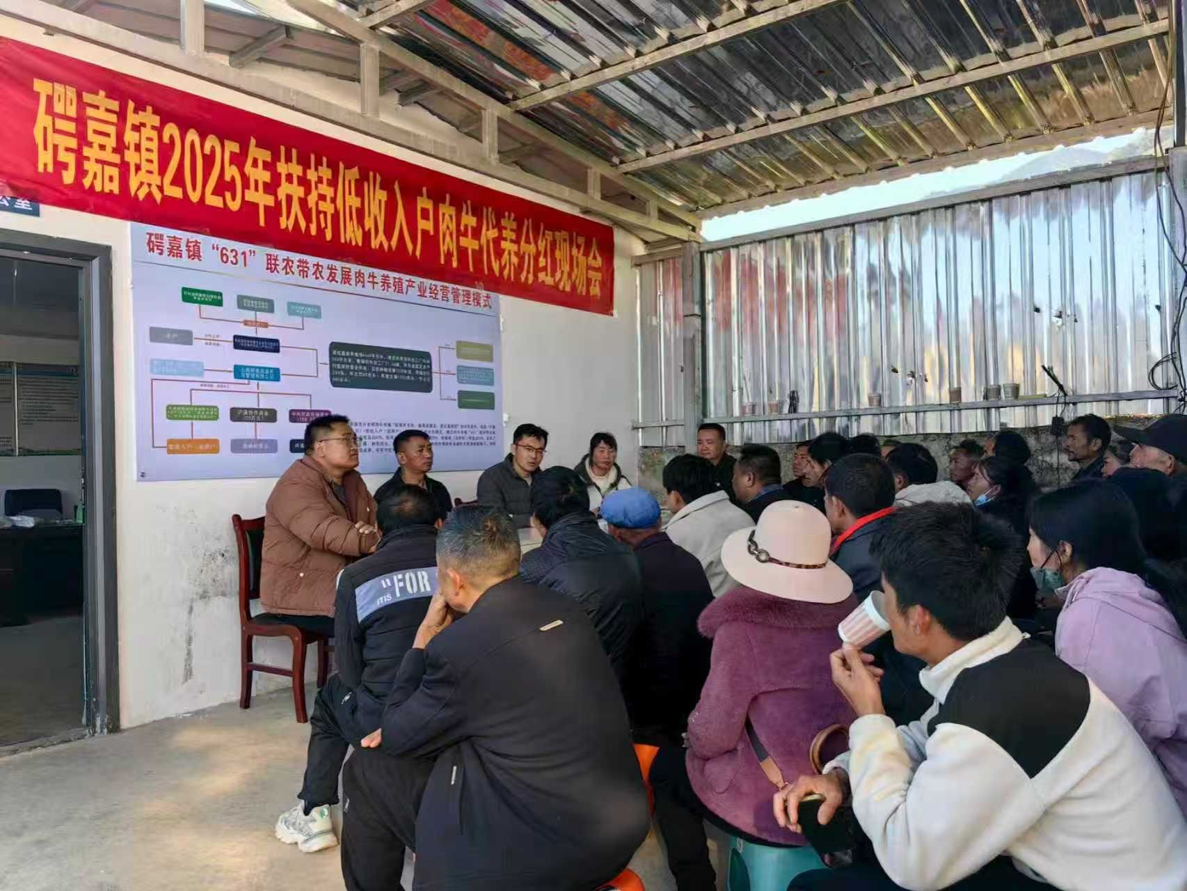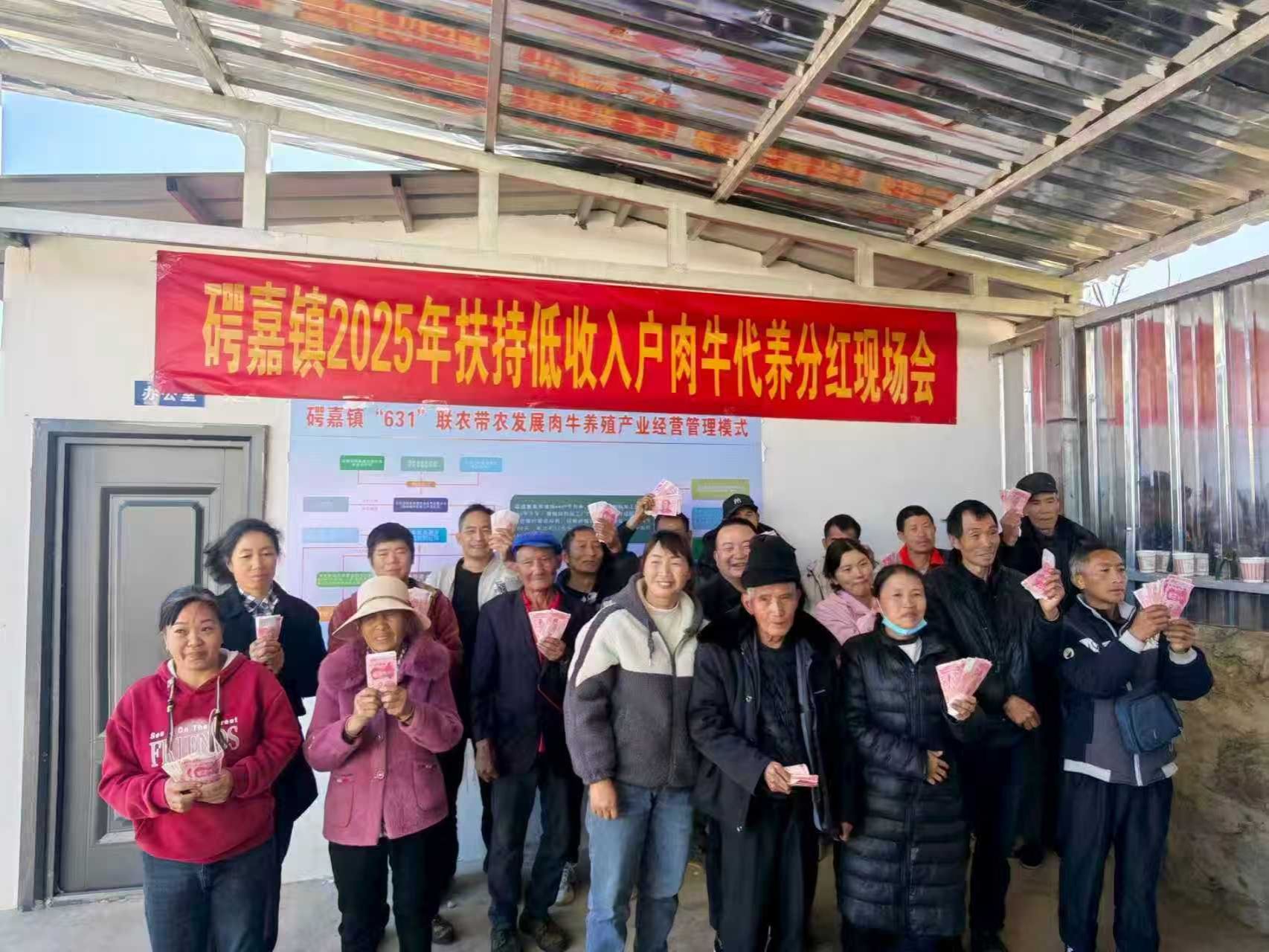 在春节来临之际,𥔲嘉镇2025年扶持低收入户肉牛代养分红会在密架村委会举行,联合社将8.8万元肉牛代养分红资金发放到78户一万元以下低收入户群众手中,分红现场气氛热烈,在村委会和企业工作人员的有序引导下,村民们耐心排队签字、领取红利,欢声笑语此起彼伏,还时不时有群众发出感慨“村子在党的领导下越来越好,我们的日子也越过越有盼头”。