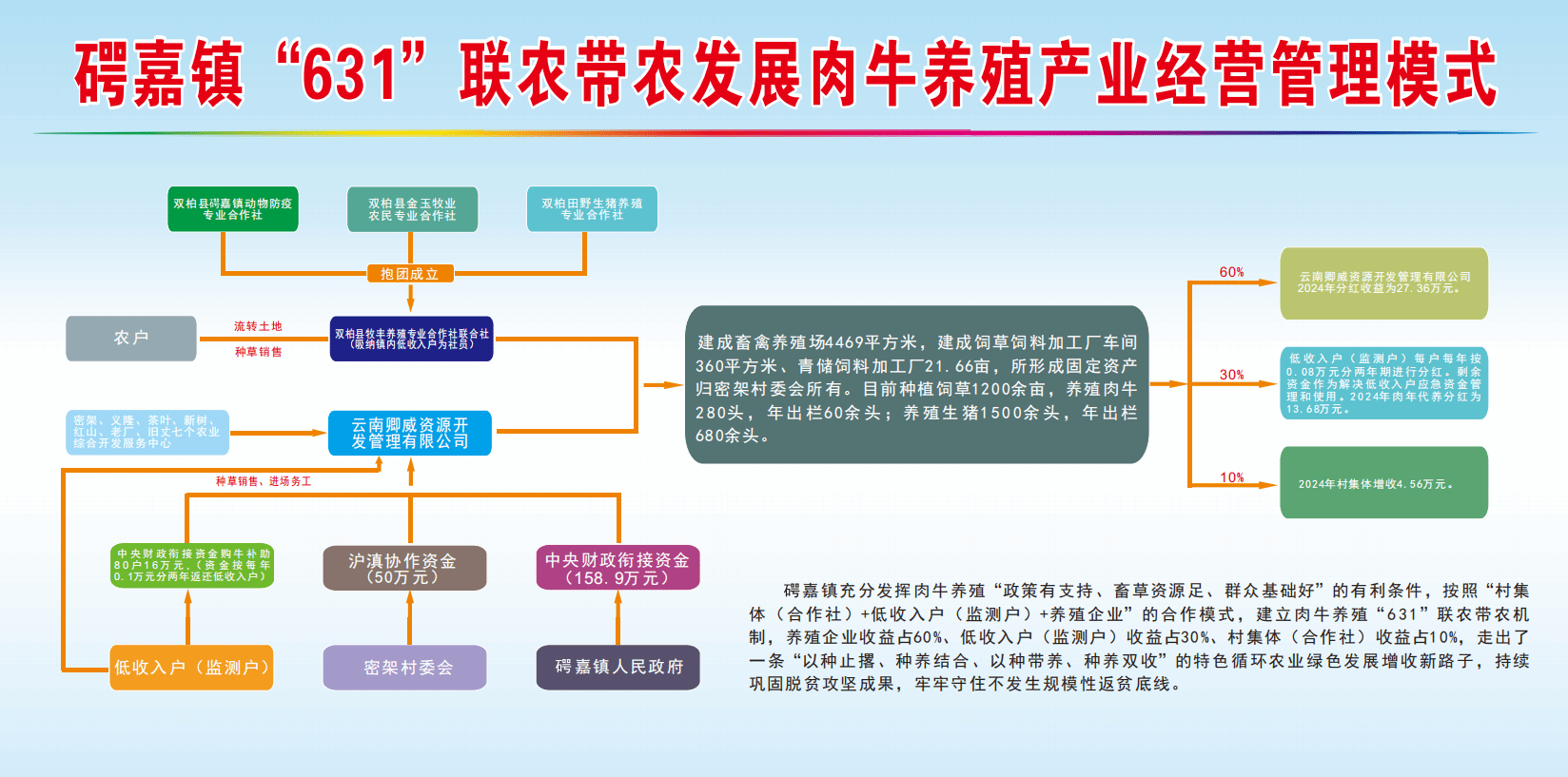 近年来,𥔲嘉镇充分发挥党建引领作用,积极争取投入中央财政衔接资金、沪滇协作资金208.9万元作为本金,盘活闲置资产成立村集体合作社联合社,将全镇低收入户(监测户)吸纳为社员,依托联合社引进养殖企业向无能力养殖的低收入户提供肉牛委托代养服务,建立了“631”联农带农机制(养殖企业收益占60%、低收入户(监测户)收益占30%、村集体(联合社)收益占10%,),走出了一条“以种止撂、种养结合、以种带养、种养双收”的特色循环农业绿色发展增收新路子,让肉牛产业成为乡村振兴的强劲引擎。