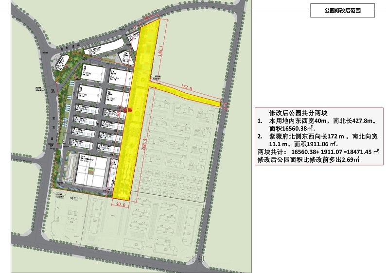 (1)原规划用地内景观大道东西宽核减为40米,南北长延伸为427.8米,面积16560.38平方米。