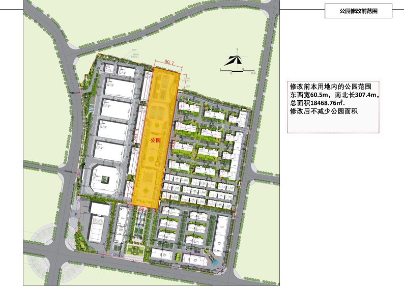拟将用地范围内原规划东西宽为60.5米,南北长为307.4米,总面积为18468.76㎡的景观大道分为两块布置: