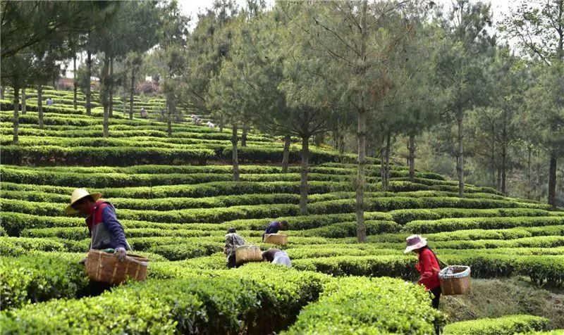 从高处俯瞰,茶园里一层层漾开的绿浪犹如一幅长卷,参差错落地勾勒出自然圆润的曲线,把茶园装点得清新自然,茶农们背着小竹篓穿梭于茶垄间,手指在茶树枝叶间欢快飞舞,构成一幅美丽的乡村画卷。