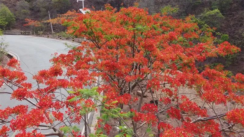 沿着双新公路盘亘蜿蜒,越走地势越低,离目的地越近,空气越发闷热起来。近20公里的沿江公路,凤凰花树在炽热地燃烧起来了,花团锦簇,像彝家火塘里的火焰,红得那么灿烂、那么耀眼、那么慷慨奔放!风儿摇落花瓣,地面就像铺了一路鲜红的地毯,迎接南北往来的客人迷醉在这一片红霞中。
