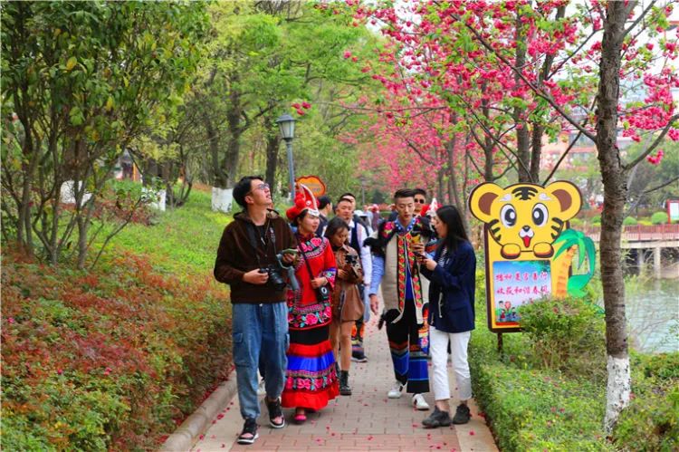 每年三月,当布谷鸟粗犷而单调的声音从远方传来,魅力丰饶、博大雄浑、神奇浪漫的虎乡大地沸腾起来,散发出蓬勃的生命力。重峦叠嶂染上浓妆淡抹的绿,千沟万壑繁花似锦。走过千年苍茫风雨的双柏,有着如婴儿的眼睛一样干净纯粹的天空,蓝得深邃透心,每立方厘米3600个以上的大气负氧离子涤荡你内心的每一个角落,棉花般柔软的云朵,跌进明镜似的国家级水利风景区查姆湖,水天一色。查姆湖畔莺声燕语,柳烟花雾,春色撩人。在天地起源广场上,四根雄伟的图腾柱子和老虎笙浮雕相映成趣;在查姆广场上,可见巨大的查姆书卷雕塑静静地等候着你去解读。沿着查姆湖游道徜徉,途经葫芦广场、彝族坊间文化、彝族虎面具文化长廊、湖心岛、福桥、虎山广场,猴园、情人桥、湿地公园等景点,看似平淡无奇的布局和浮雕,在讲述彝族发展的历史好信仰。查姆湖的名字源自彝族创世史诗《查姆》,形似史诗中描绘的多依树,它像一块巨大的翡翠闪着耀眼的光泽,白鹭、翠鸟、鲤鱼、青鱼、草鱼、鲢鱼、清水虾等幸福地生活在这里,成群结队的水鸭子在水面追逐嬉戏,它们在湖面划开欢乐的水纹,抚平了你心的褶皱。