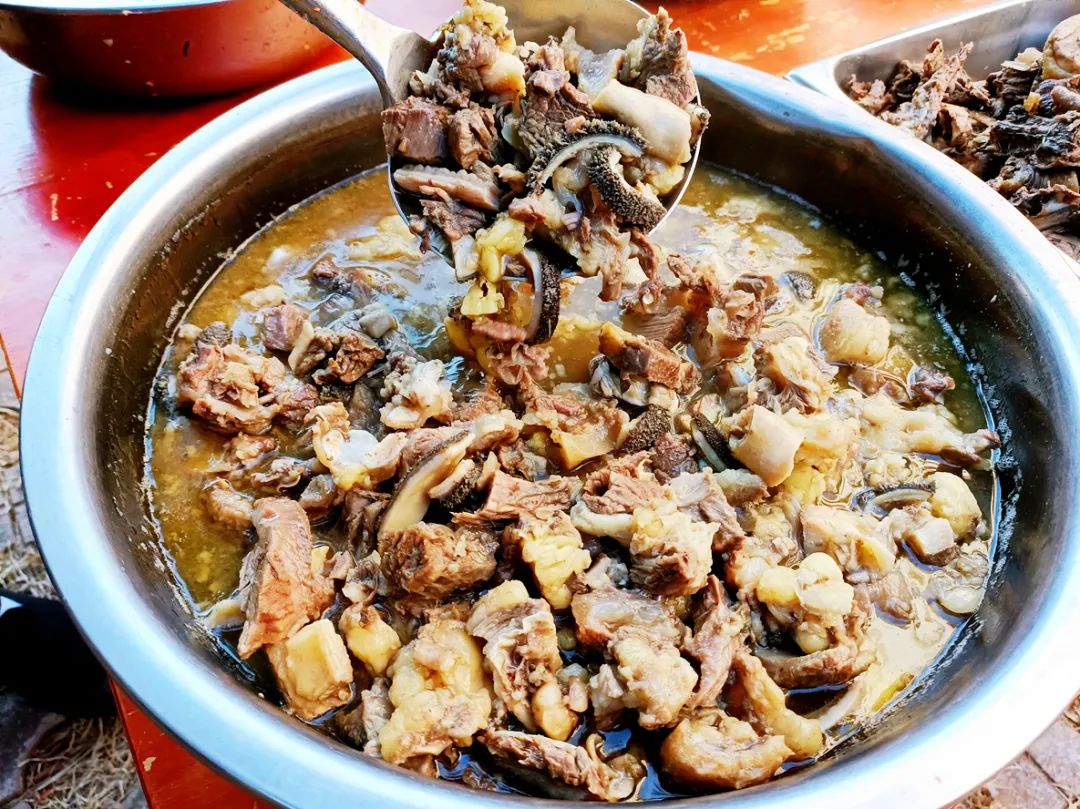 当夕阳斜照,欢笑的余音藏进四野的脚印中。散落的彝家寨子炊烟升起,牛羊归圈,顽童寻母。此时,查姆老屋、江边民宿的佳肴都可以抚慰你的胃,腊肉炒攀枝花、素炒攀枝花、秘制烤乳猪、香疙瘩鸡、底土荞粑粑、放山牛羊汤锅、原生态江鱼、野生菌、山茅野菜,应有尽有,单是一碗的搭配牛汤锅有十几种配料的蘸水就足以惊艳,再配上一杯冰镇红糖酸角汁,幸福感爆棚。
