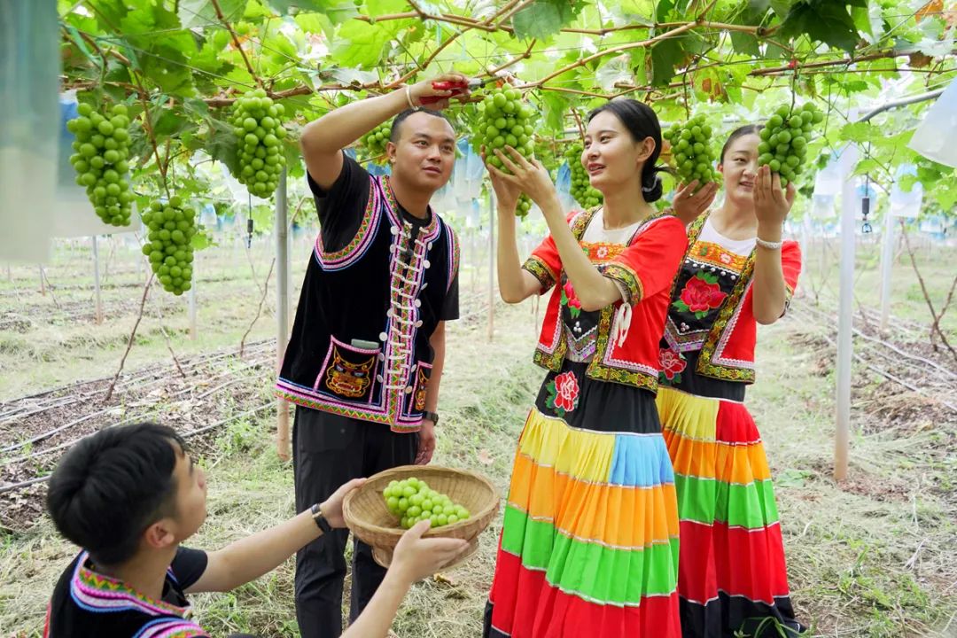 阳光玫瑰葡萄住在大棚里,走进葡萄园,一排排整齐的葡萄架上枝叶繁茂,一咕噜一咕噜翡翠般果子坠在枝丫上,让人看了心生欢喜,热带河谷气候充足的日照使之糖分丰盈,形成“甜、脆、香”的绝佳口感。独特的玫瑰香味混合着淡淡的牛奶香,皮薄无核,清甜多汁,不带一丝苦涩,果肉紧实无籽,可整粒连皮食用,一口咬下去果汁四溢。阳光玫瑰葡萄于2018年通过“绿色食品”认证,成为可扫码追溯的质量安全品牌。几年来,它的销量如同彝族群众的生活水平遥遥直上,是来到普龙不能放弃的水果之一。