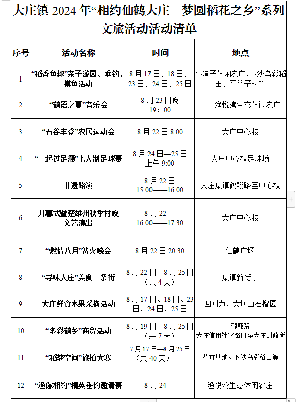 为进一步发挥民族文化节庆活动对全镇经济社会发展的辐射带动作用,提升“仙鹤大庄 稻花之乡”美誉度、知名度,展示好平安大庄、文明大庄、富裕大庄、幸福大庄、和谐大庄面貌,促进乡村旅游小镇建设,大庄镇定于2024年8月17日—8月25日(农历七月十四至七月廿二)在大庄镇集镇举办双柏县大庄镇2024年“相约仙鹤大庄 梦圆稻花之乡”系列文旅活动,现将系列活动公告如下: