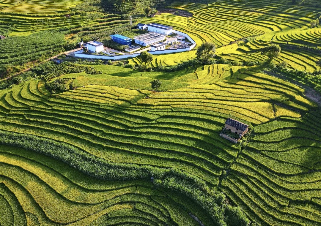 深秋时节,是嘉梯田最美的季节之一,田野一片金黄,微风吹过,稻谷翻起金色的稻浪,呈现出一幅绝美的金秋丰收画卷。金色的稻田似调色盘般镶嵌在大地上,犹如浑然天成的水彩画,甚为养眼,令人心醉。