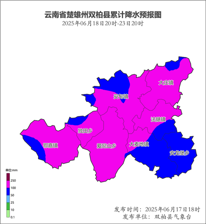 根据最新气象资料分析,受高空槽、低涡切变、地面冷锋和西南季风共同影响,预计6月19日至23日,双柏县将出现持续性大到暴雨、局部大暴雨天气过程,过程累计降雨量80-120毫米、局地200毫米以上,最大小时降雨量40-60毫米,过程期间将伴有局地冰雹、雷暴大风、短时强降水等强对流天气。具体预报如下:
