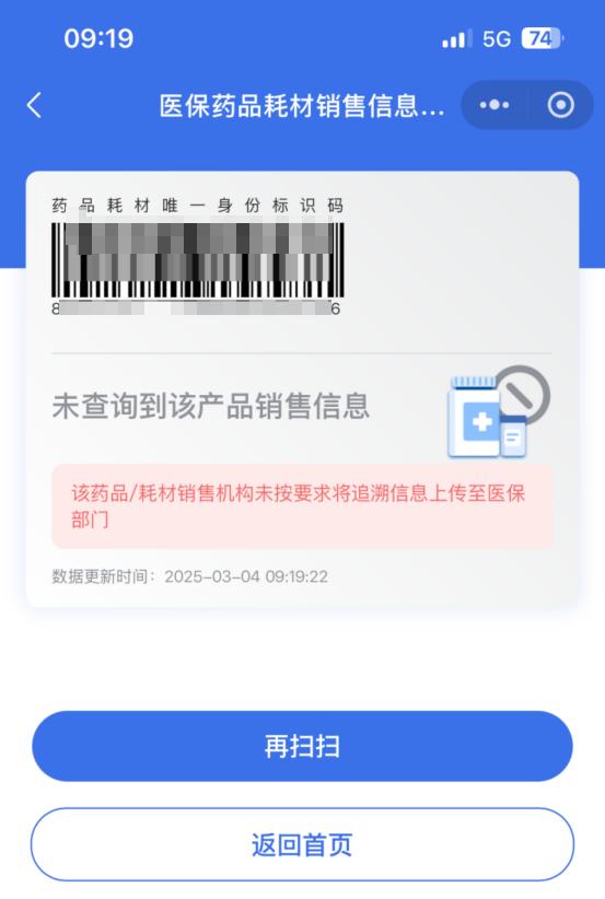 界面如提示“未查询到该产品销售信息”,则说明该药品销售机构未按要求将追溯信息上传至医保信息平台,患者可以要求该药品销售机构出示药品来源单据,以确保药品安全和来源渠道合法。