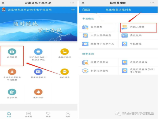 第二步——微信公众号缴费:搜索关注“云南省电子税务局”微信公众号——业务办理——社保缴费——代他人缴费——输入缴费人信息——结算——选择“医保账户支付”即完成共济绑定人的个人账户代扣