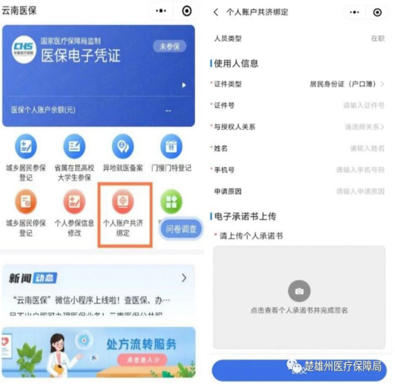 第一步——个人账户共济绑定:搜索“云南医保”微信小程序——手机号码登录——个人账户共济绑定—输入使用人(家人)信息——签名——提交(已经绑定过的可以跳过这一步)