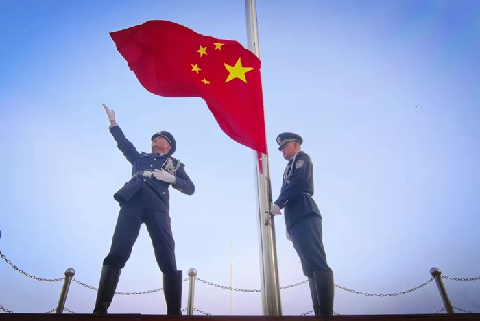 上午9时,随着指挥员的一声令下,升旗仪式正式开始,仪仗队员迈着整齐的步伐护送国旗走向升旗台。伴随着中华人民共和国国歌振奋激昂的旋律,鲜艳的五星红旗冉冉升起,全体民警辅警身姿笔挺、目光坚定,面向国旗敬礼,抒发对祖国的诚挚祝福与深深敬意。