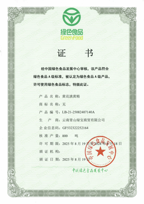 近日,经中国绿色食品发展中心审核,由云南青山绿宝商贸有限公司申请的红花滇黄精和黄花滇黄精两个产品取得绿色食品认证证书,在2个滇黄精产品上许可使用绿色食品标志,成为双柏县首个获绿色食品认证的中药材产品。