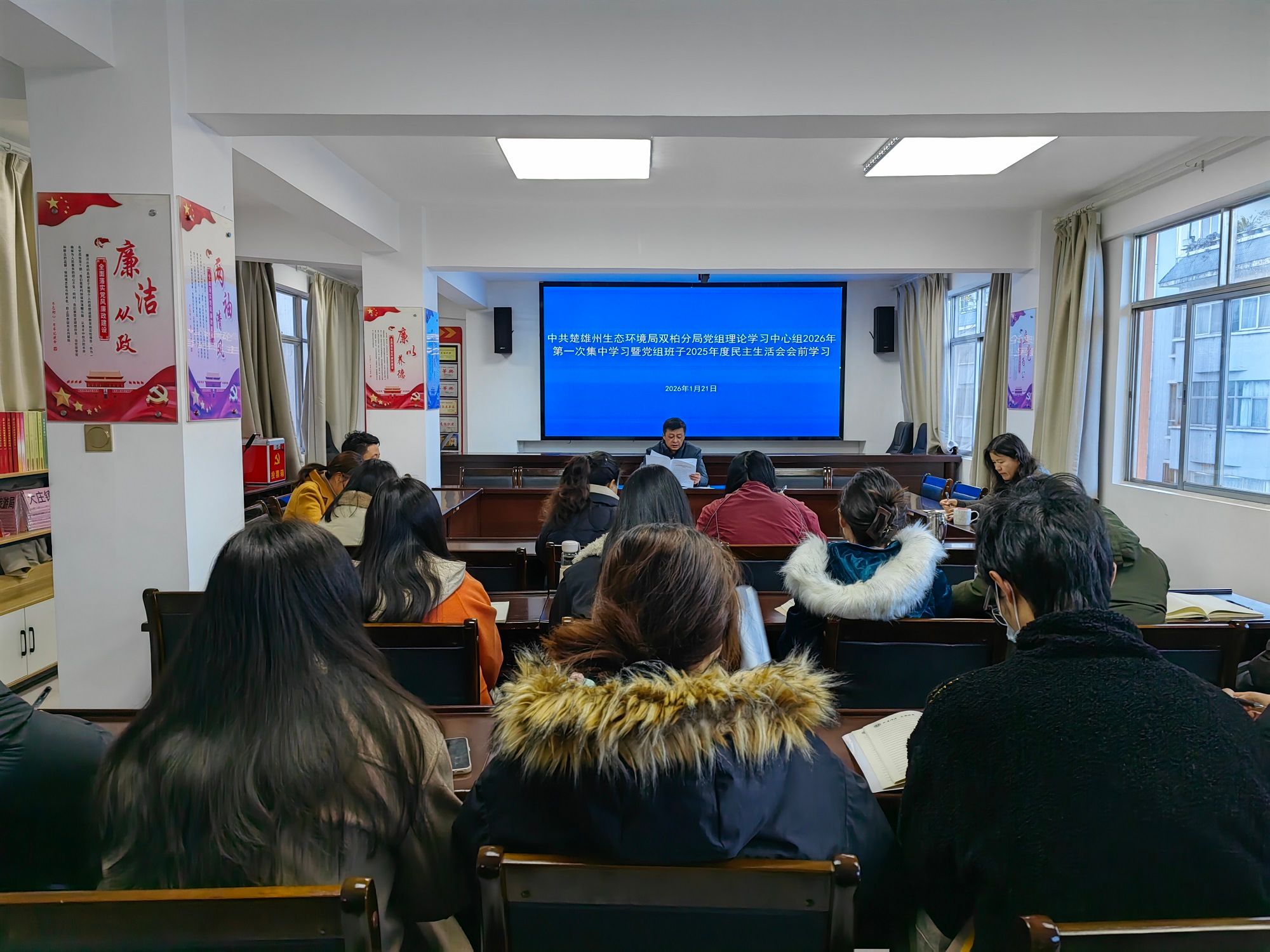 2026年1月21日上午,中共楚雄州生态环境局双柏分局党组举行党组理论学习中心组2026年第一次集中学习暨党组班子2025年度民主生活会会前学习,会议由党组书记、局长李铭主持,全体干部职工参加会议。