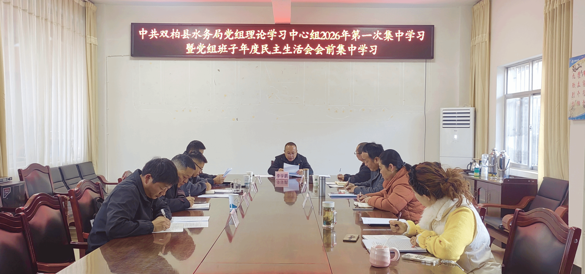 2026年1月21日,双柏县水务局召开党组理论学习中心组 2026年第一次集中学习暨2025年度民主生活会会前集中学习会议,局党组书记李学鹏主持会议并讲话,四位班子成员和党支部书记等参加学习并作交流发言。
