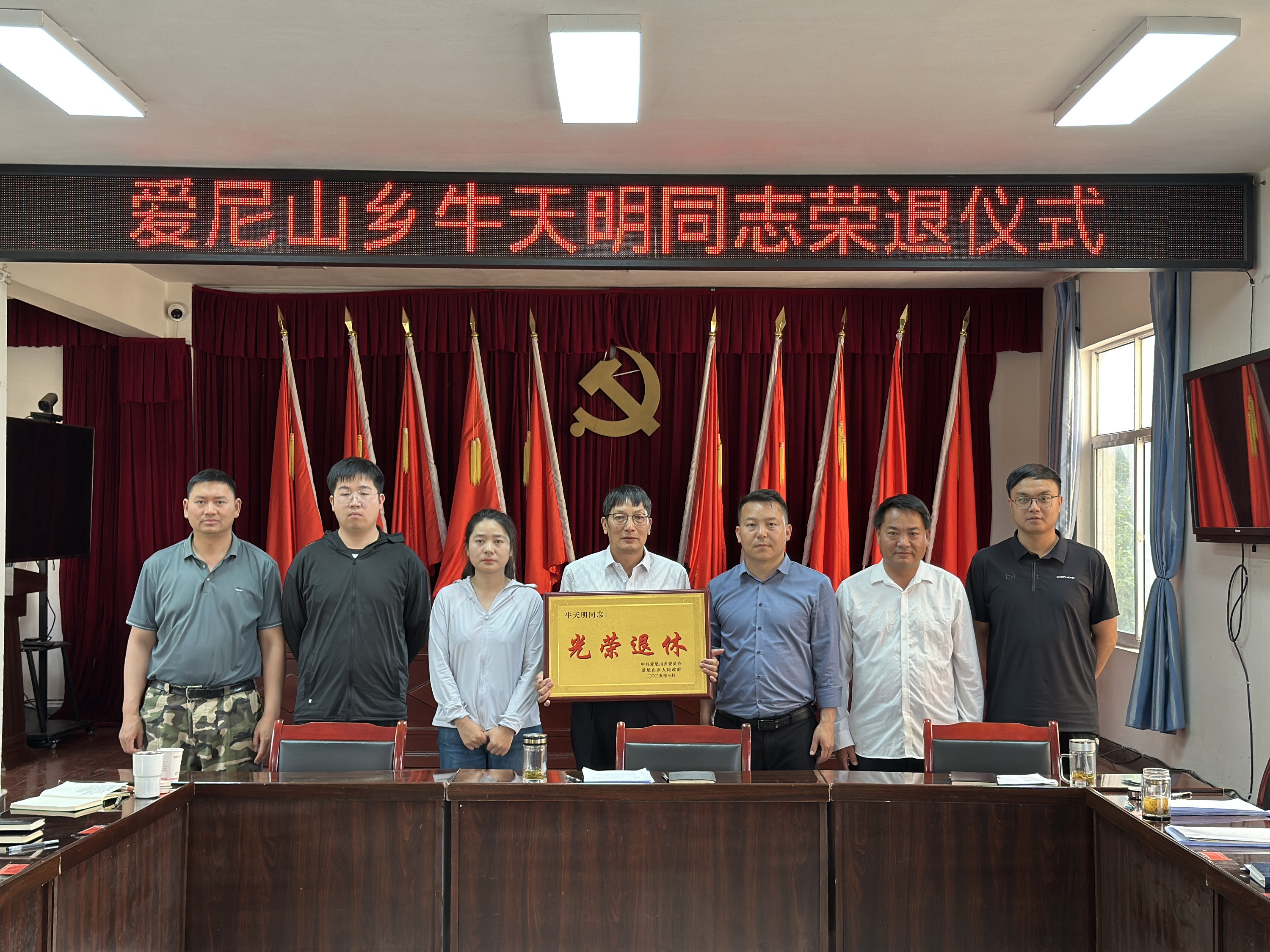 为深入贯彻落实习近平总书记关于老干部工作的重要论述精神,增强离退休干部的政治荣誉感、组织归属感和生活幸福感,表达对退休干部的敬意和感激之情。4月27日下午,爱尼山乡召开退休干部座谈会,为乡农业农村发展服务中心工作人员牛天明同志举行光荣退休仪式。乡党委书记杨祖龙主持会议,在家的党政班子成员和干部职工代表参加会议。