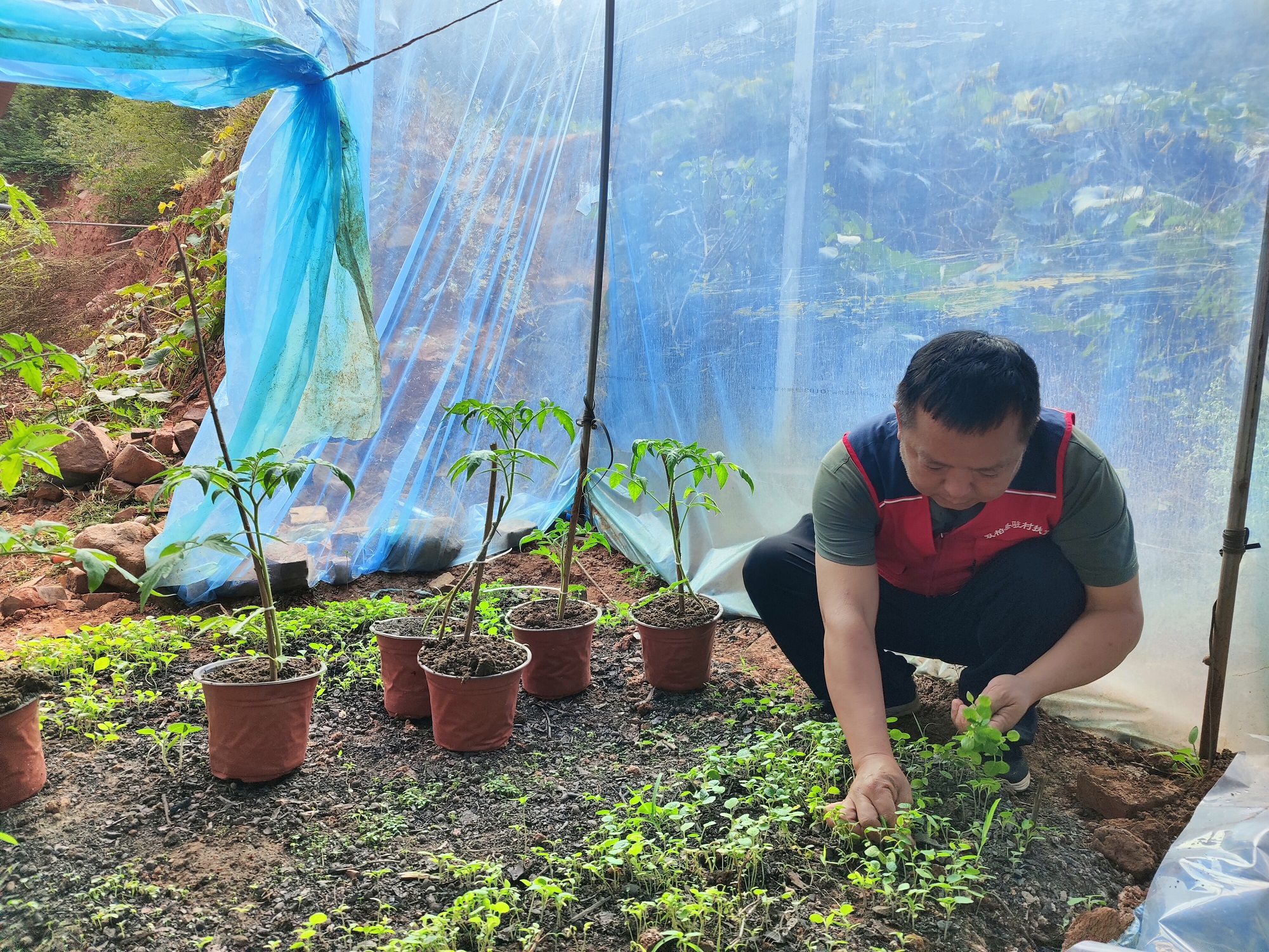 在大麦地镇峨足村委会办公楼背后,一座普通的大棚内,一棵棵手指高的小树苗正在茁壮成长,驻村工作队队长杨林忠仔细查看着每一棵幼苗的生长情况,这些看似寻常的砧木苗,是杨林忠经过无数次试验后用于嫁接西红柿的宝贵砧木。