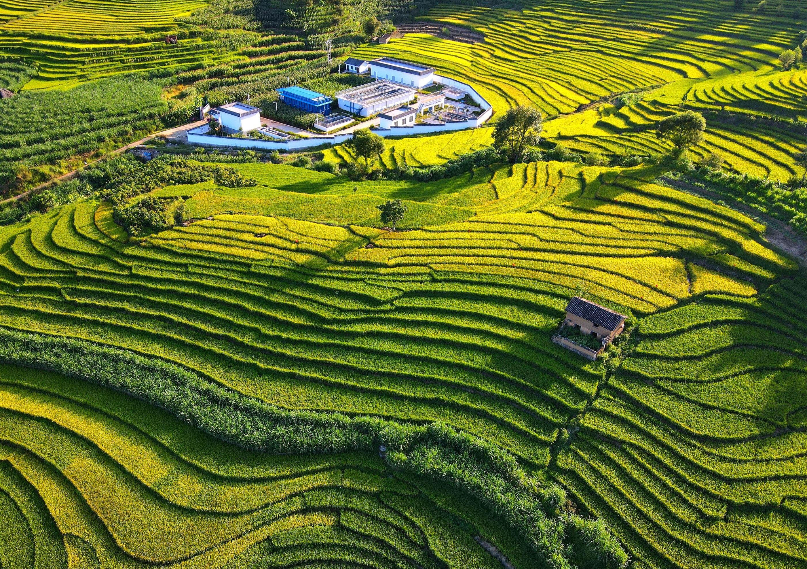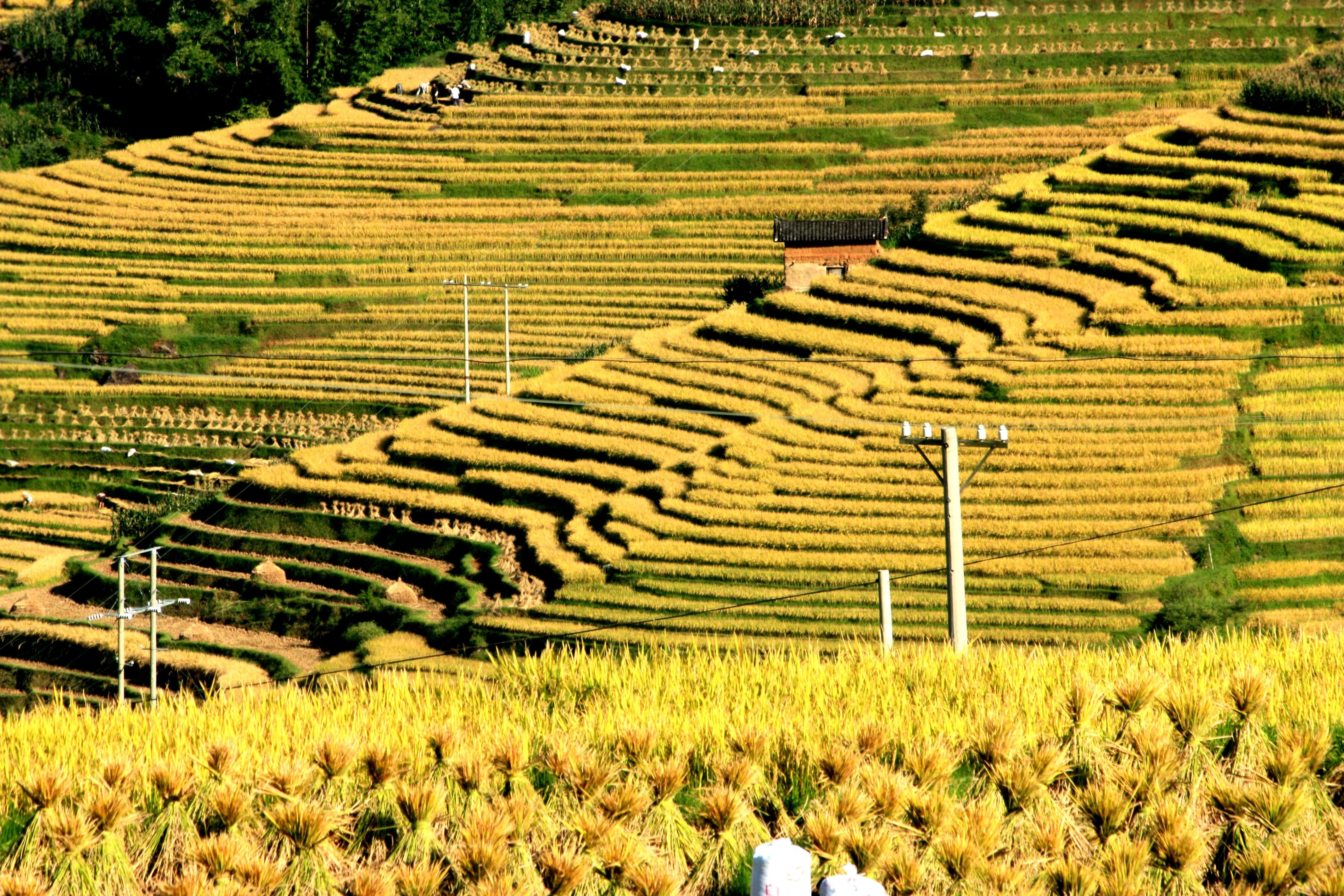 深秋时节,是(石咢)嘉梯田最美的季节之一,田野一片金黄,微风吹过,稻谷翻起金色的稻浪,呈现出一幅绝美的金秋丰收画卷。金色的稻田似调色盘般镶嵌在大地上,犹如浑然天成的水彩画,甚为养眼,令人心醉。