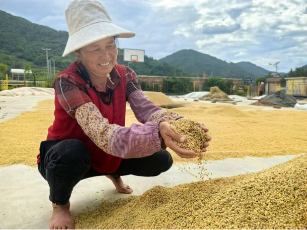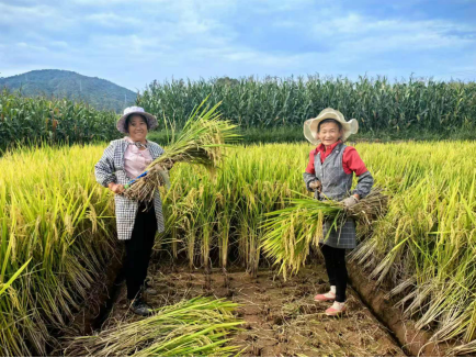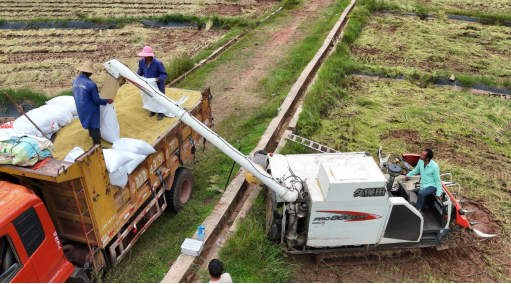在普岩村委会平掌子水稻种植示范基地,收割机在120亩金黄的稻田里来回穿梭,一行行稻穗被“揽入怀中”,吐出金色稻粒。村民们用勤劳的双手收获着一年的辛勤付出,脸上洋溢着丰收的喜悦。
