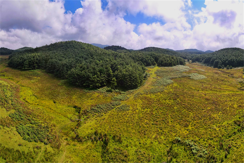 若驱车一路向上行进,半个小时左右,行至距离(石咢)嘉集镇30公里的地方,视野瞬间开阔,一望无际的松林绿草,山花遍野,这里便是(石咢)嘉大名鼎鼎的“网红”景区——九天湿地。它位于哀牢山腹自然保护区边缘,平均海拔2400米,面积约二万多亩,是云南省中部最大的高山湿地,由大马房湿地、老王坪湿地、小河坝湿地三大片组成,有着“哀牢山明珠”的美誉。湿地周围山林茂密,是观光的天然伊甸园,是游客遛马、听林涛声的理想之所。丰富的湿地资源孕育了万亩高山草甸,广阔的草甸像海湾一样镶嵌在苍茫的群山之间,芳草碧连天,牛羊悠闲啃草的声音和阵阵牧笛萦绕耳畔,置身其中让人身心豁然开朗,仿佛身处绿野茫茫的大草原一般。