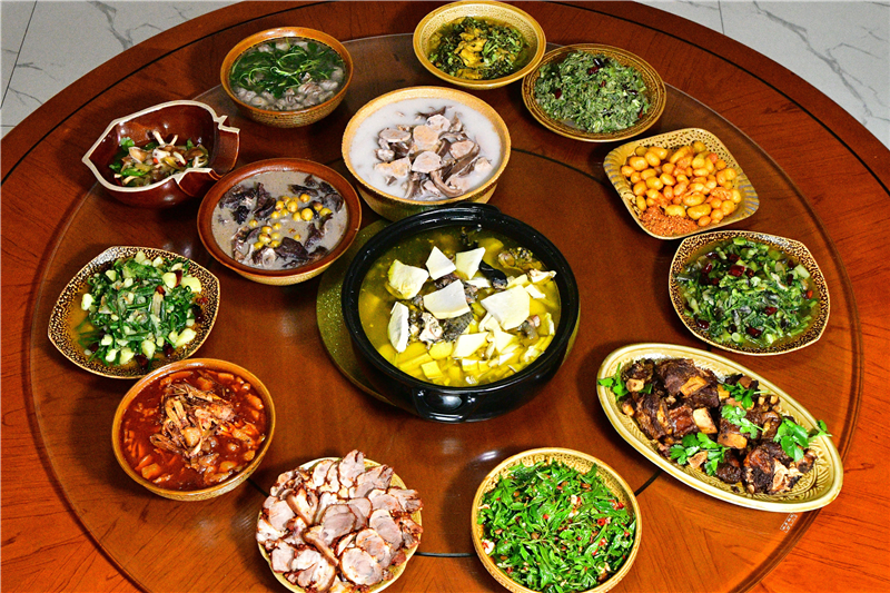 (石咢)嘉的美食文化也是其风土人情的重要组成部分。(石咢)嘉菜以其独特的“野”味和浓郁的口感而闻名。有大扎肉、肝生、黄精(重楼)煮土鸡、棕头炖鸡、野甜菜腌菜汤、刺苞菜炒火腿、凉拌茶叶菜......这些美食不仅满足了人们的口腹之欲,更蕴含着丰富的养生之道,也传承了(石咢)嘉浓厚的饮食文化。