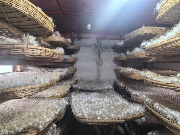 在村头的一栋住宅里,年过六旬的“养蚕翁”何正海正在给第二批蚕宝宝添叶。竹匾中,上万条白胖的蚕儿齐刷刷昂首进食,“虽然这一批我只养了一张蚕,但是大概能产出60公斤左右的蚕茧,价格保持在64-72元/公斤,每年可以养4-5批,都有2万多的收入”。老人轻抚蚕匾,眼角笑出细密的皱纹。