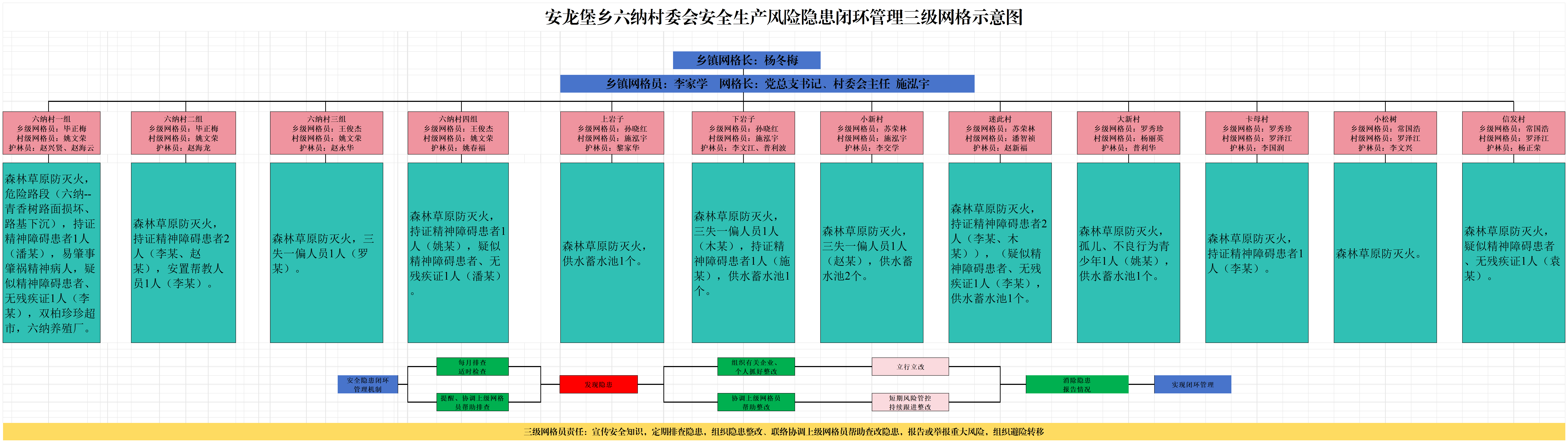 三级包保,织密风险防范“责任网”。严格落实“党政同责、一岗双责、齐抓共管、失职追责”和“三管三必须”要求,将全乡划分为片、村、组三级网格,采取乡党政主要领导包片、挂包班子成员和村(社区)党总支书记包村、乡村两级干部包组的工作责任制,对包保领域的风险进行分析研判、排查整治,构建层层有人管、事事有人抓、一环扣一环的落实链条。