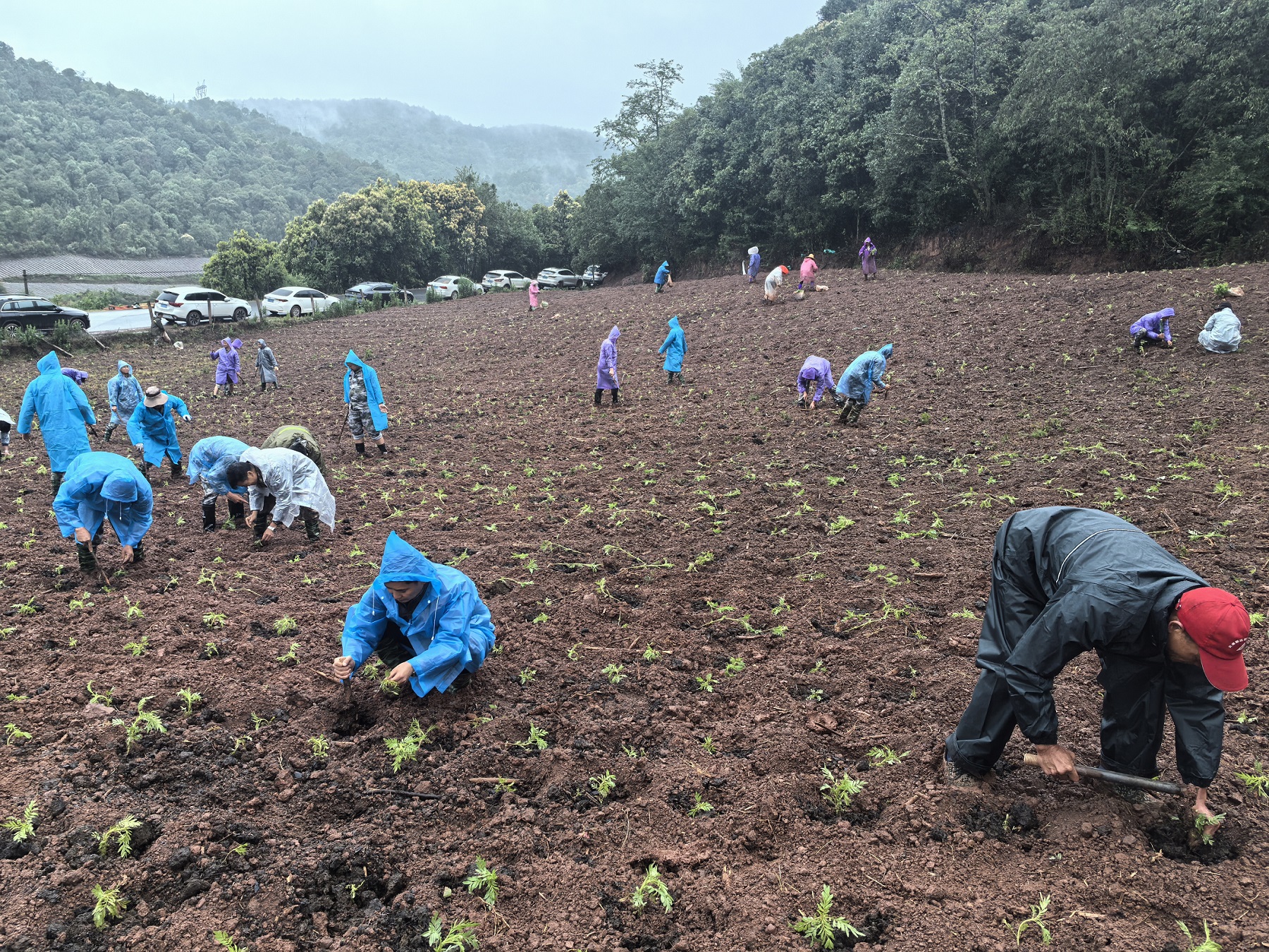 活动现场,虽然下起了小雨,但大家热情高涨,有的负责搬运万寿菊幼苗,有的翻地、有的播种,大家各司其职、分工明确、默契配合。