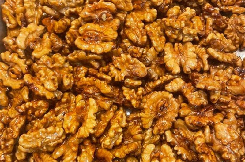 油炸核桃仁酥脆可口,风味独特,深受大家的喜爱。热锅下油,待油至五成热时下核桃仁,小火慢炸,炸至酥脆后撒上些许食盐即可。喜甜的朋友也可做成甜食,捞出酥脆的核桃后,用冰糖炒成糖色,把炸好的核桃下锅翻炒,起锅时撒上一层芝麻,晾凉后开吃,核桃独有的清香和糖的香甜滋味同时在嘴里蔓延开,外甜里酥,口感丰富,根本停不下来。