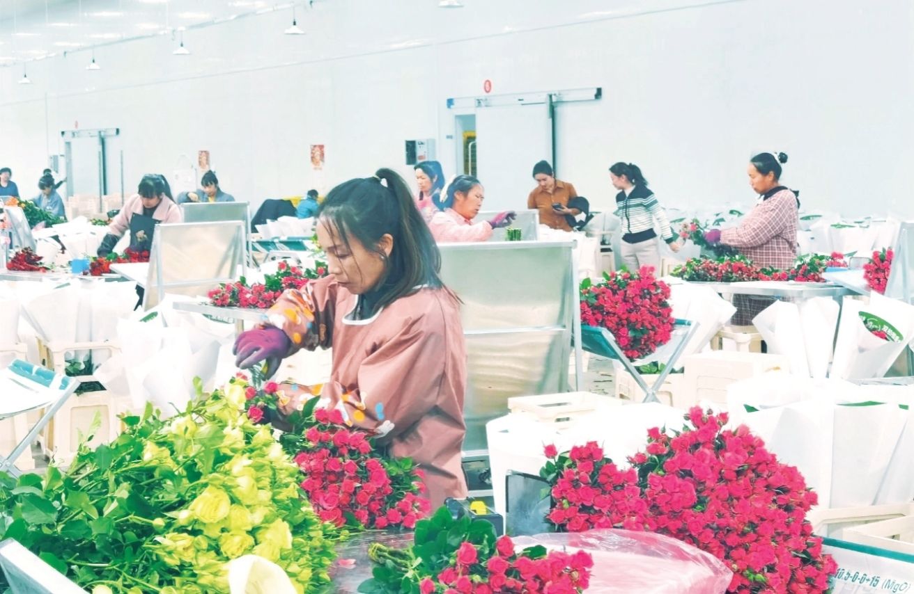 冬日夜晚,双柏县大庄镇植盛农业花卉种植基地里灯火通明、暖意融融,一枝枝玫瑰正拔节生长。“虽然是寒冬,但我们的花不愁销路,每天发货量超10万枝,订单排到了春节后。”大庄镇数字花卉党总支书记张俊辉语气中满是底气。
