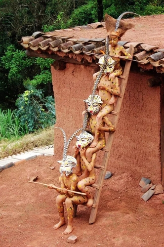 小豹子节这一天,全村的彝族群众就从村中选出十几名9至12岁的男孩子做小豹子,再从六汁江边捡回白色、红色、黑色、黄色的各种石头,磨成五颜六色的墨汁,然后脱光这些男孩子的衣裤,在赤裸的身上绘满豹子花纹及日月星辰等图案。从棕树上剥下棕片,缝制成一个面具戴在裸体男孩头上,头上再插两根长长的、色泽艳丽的箐鸡尾毛。化装完毕的小豹子们就不能再说话,因此,就是平时和他们最亲近的伙伴也很难认出他们。在这种棕片面具之下,他们可以无拘无束地进行小豹子笙的表演。