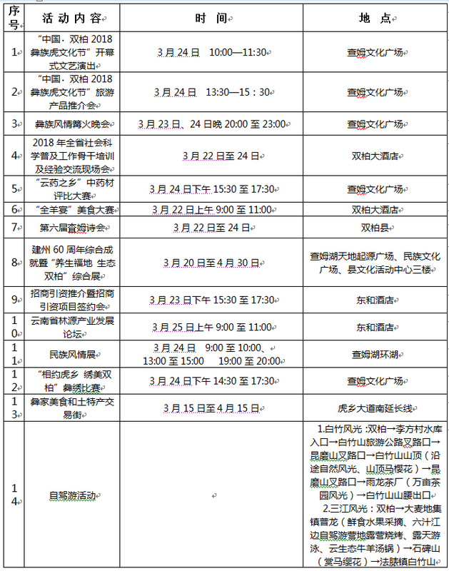 为进一步弘扬双柏民族传统文化,不断丰富广大群众精神文化生活, 3月24日至25日(农历二月初八至初九),双柏将在县城妥甸举行“中国•双柏2018年彝族虎文化节”系列活动。本届虎文化节以“查姆故地 秘境双柏”为主题。
