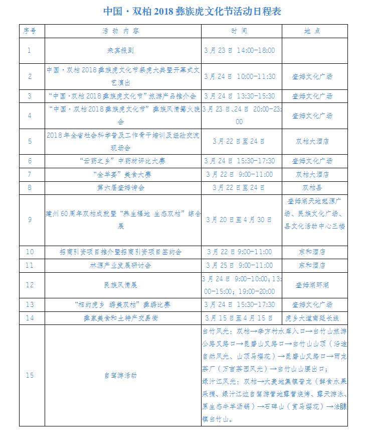 为进一步弘扬双柏民族传统文化,不断丰富广大群众精神文化生活,3月24日至25日(农历二月初八至初九),以“查姆故地 秘境双柏”为主题的中国•双柏2018年彝族虎文化将在双柏县城妥甸举办。