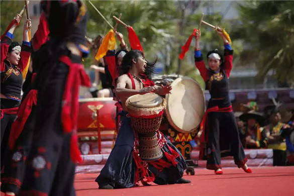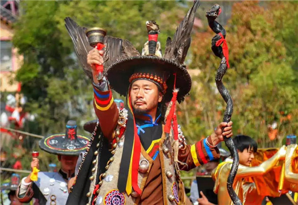 开幕式文艺演出中,最隆重和独特的是彝族毕摩祭虎大典。来自云贵川三省的资深毕摩齐聚舞台,一起诵读平安经,为当地群众和八方宾客祈福纳祥。 “舌舔火犁”是彝族的一个传统祭祀和表演项目,只见“毕摩”手持刚用火烧红的铁犁头,伸出舌头去舔却丝毫没有被烫伤。