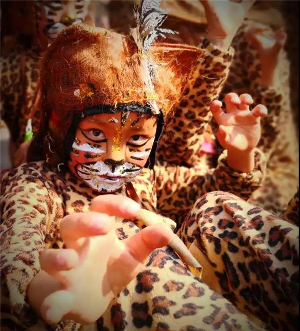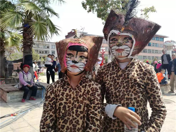 跳小豹子笙的队伍由几十名9至12岁的男孩组成,他们装扮成小豹子的模样,戴上棕片面具进行表演,跺脚、飞脚、转脚、甩脚,踏步、挥棍、翻棍、摇棍等一系列趣味盎然的舞蹈动作,吸人眼球。