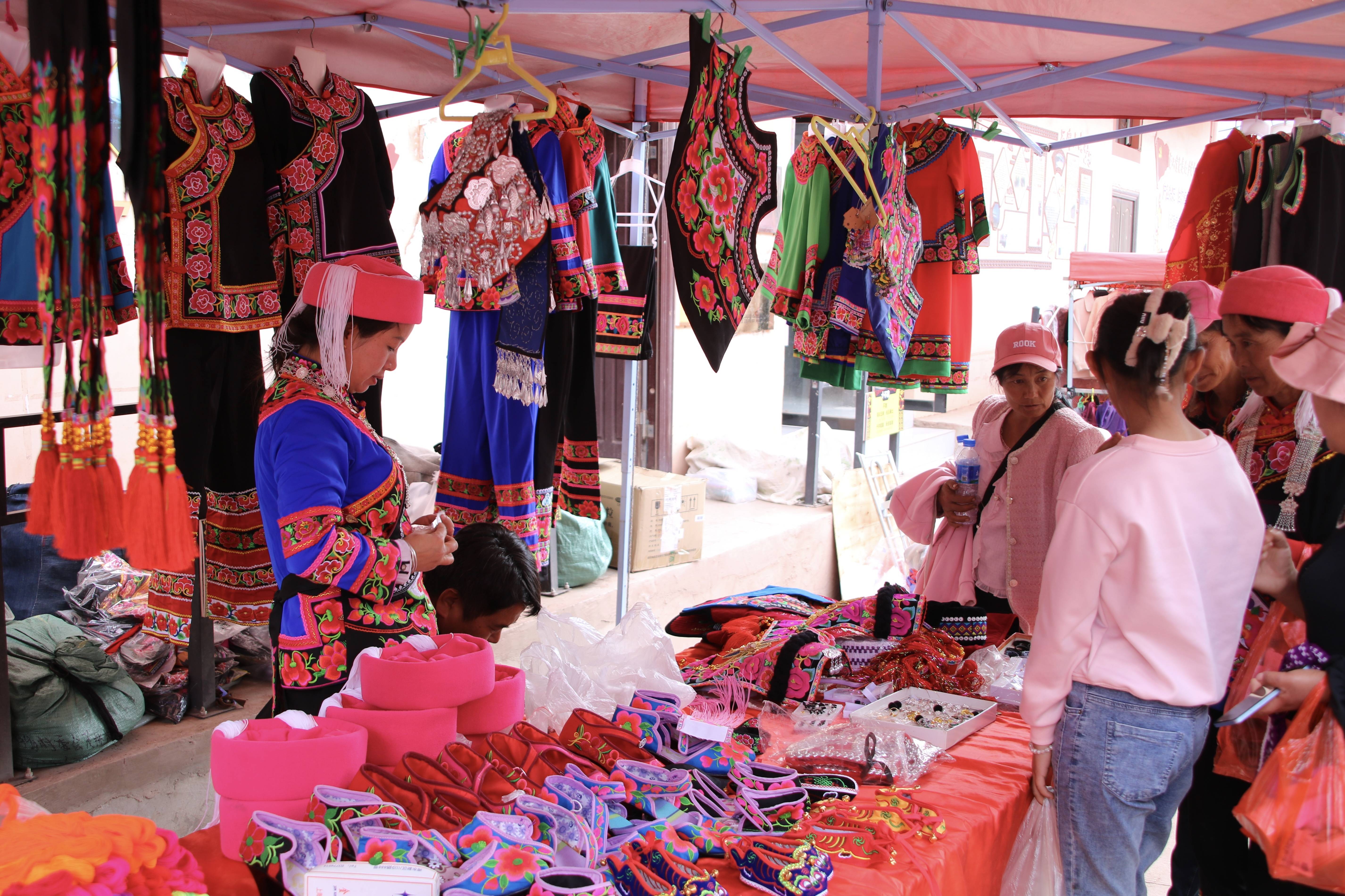 除了文化展演活动,在集市摊位区,同样也是热闹非凡。穿梭在一个又一个小摊之间,彝族刺绣、农特产品一应俱全,红火喜庆的年味元素让人应接不暇,浓郁的乡土人情扑面而来。
