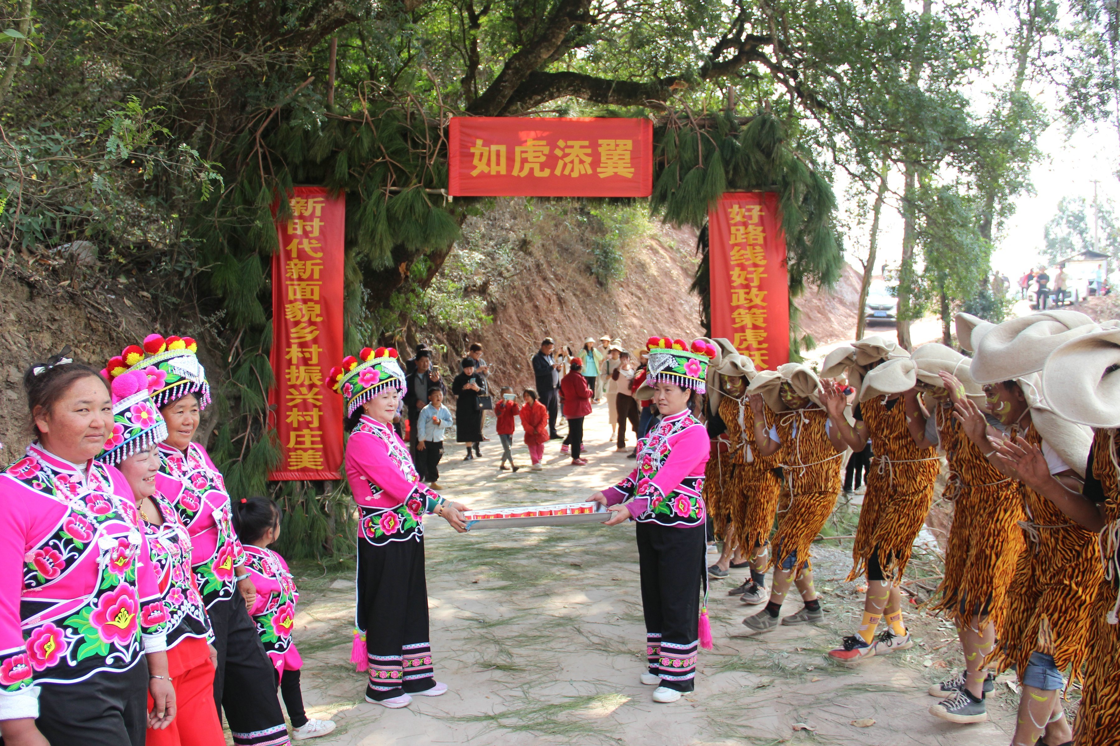 毕摩负责领队整套祭祀仪式,组织20多名男性将毡子捆扎成的虎皮披在肩上,身体用各种颜料画上虎纹,在铜锣和羊皮扁鼓伴奏下跳虎图腾舞。队伍中的“小老虎”代表虎神庇佑下成长的新一代;猫作为代替老虎“徒弟”在虎窜家时收下村民供奉的心意;正月初十时“虎王”“山神”在祭祀时负责背“小老虎”。